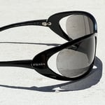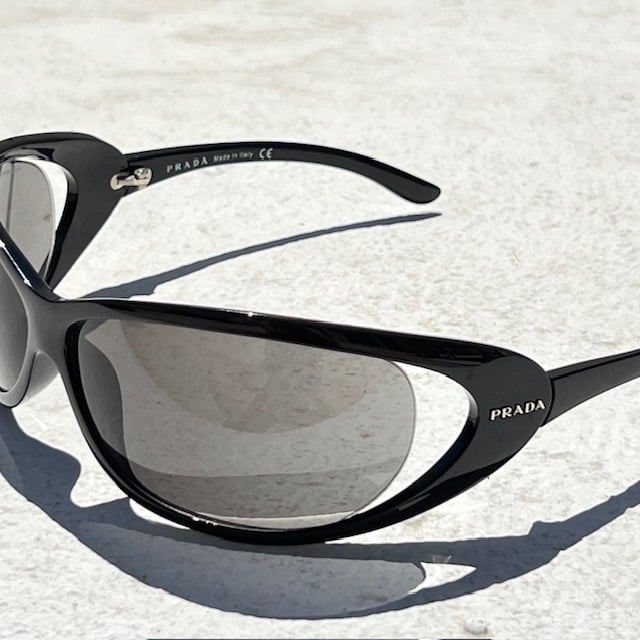 Vintage Prada Sport sunglasses featuring a glossy black wraparound oval frame with dark lenses and silver Prada logos at the temples. Made in Italy.