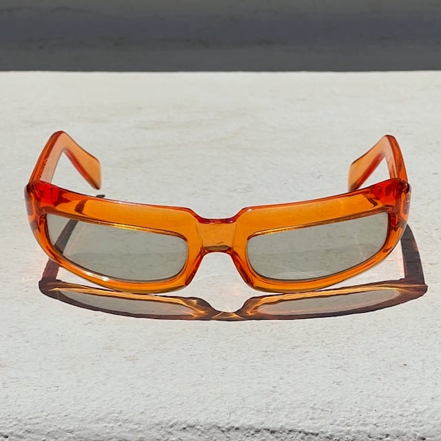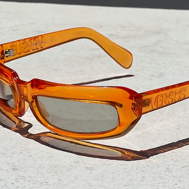 Vintage Versus by Versace sunglasses featuring a translucent orange wrap-style frame with narrow tinted lenses and embossed Versus branding at the temples.