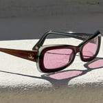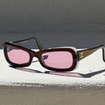 Color: Two-tone burgundy and purple frame, pink lenses, gold-tone logo detail