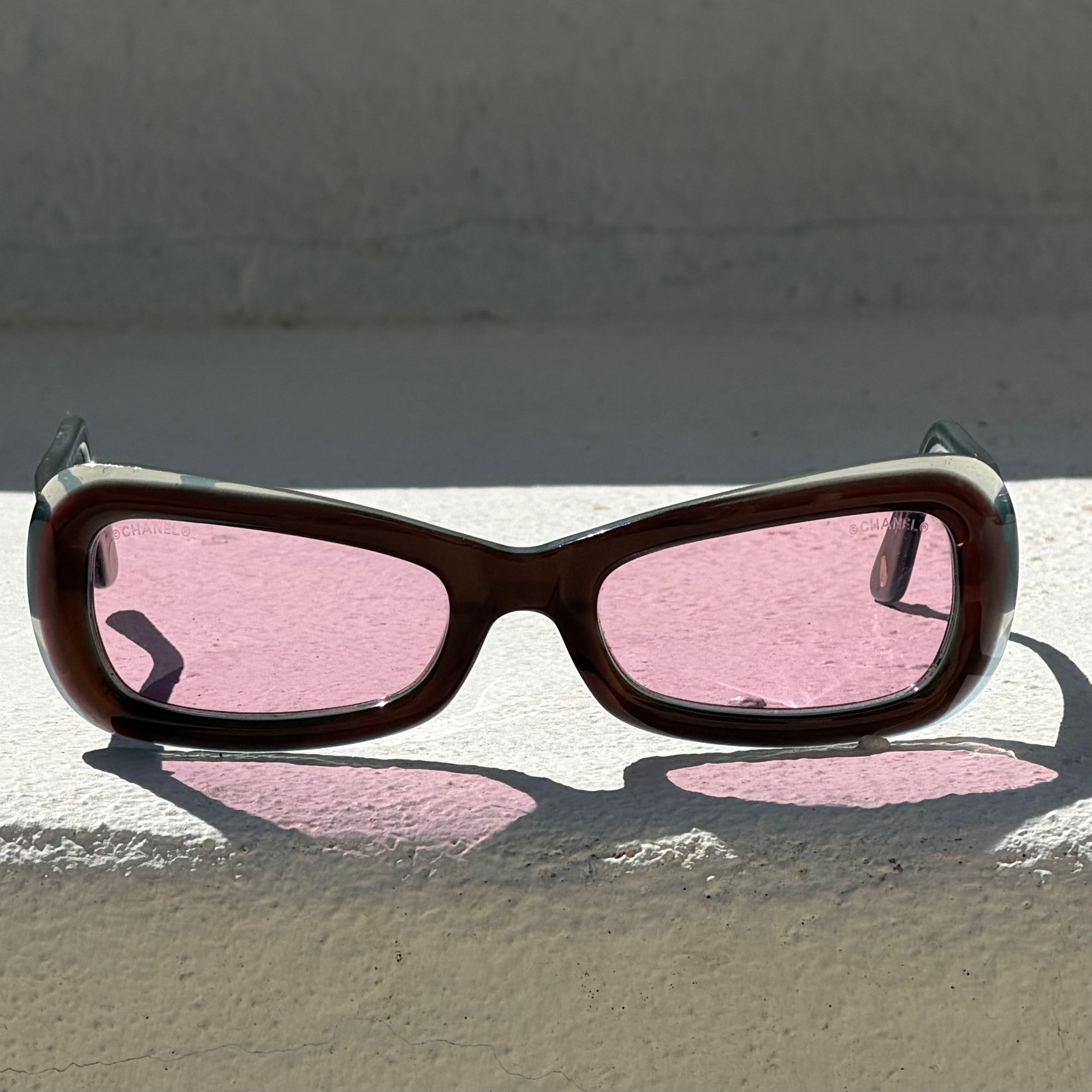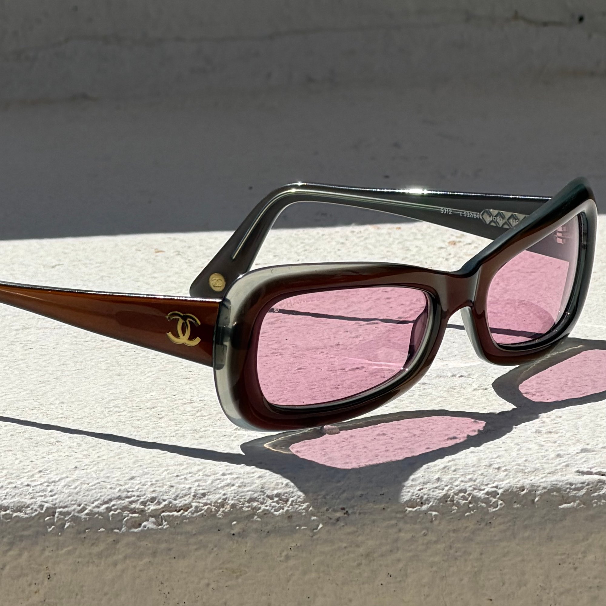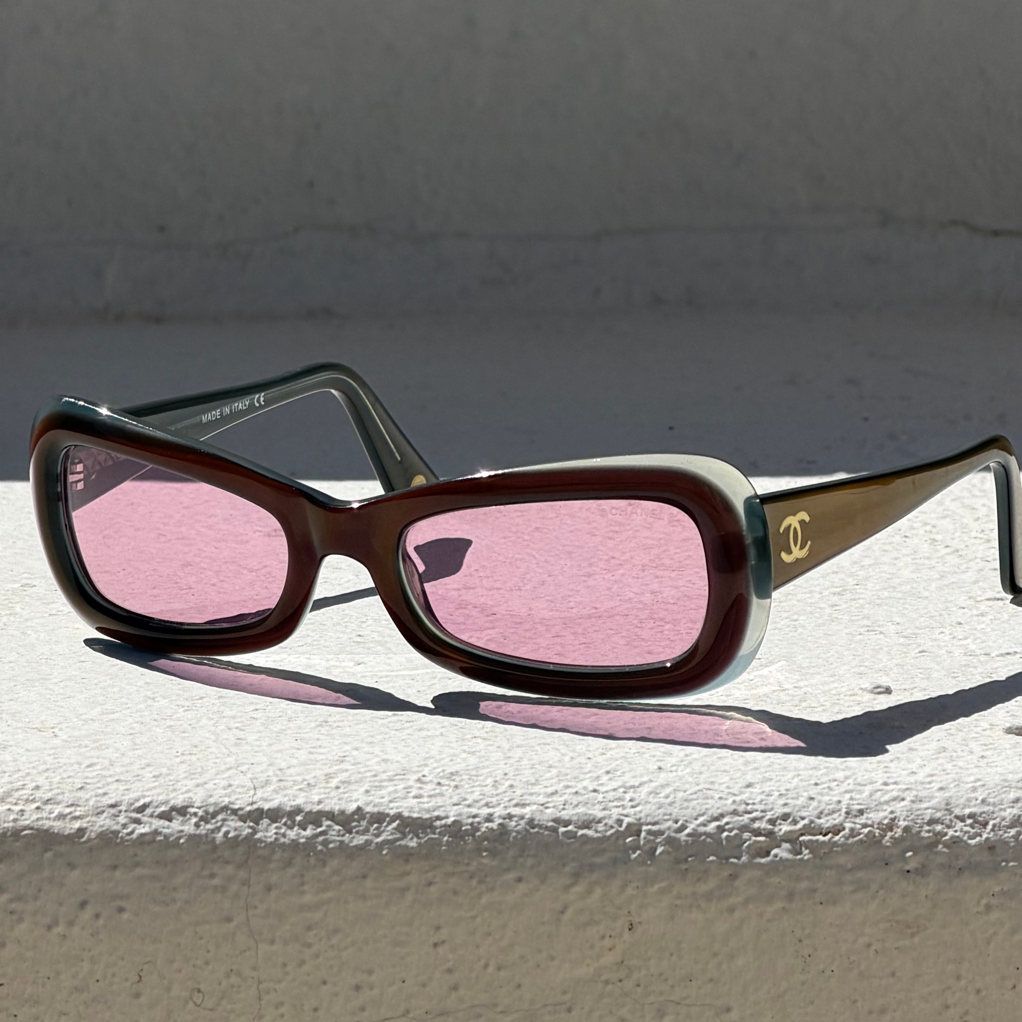 Vintage Chanel sunglasses featuring a two-tone burgundy and purple rectangular silhouette with pink-tinted lenses and signature gold-tone CC logo detailing at the temples.